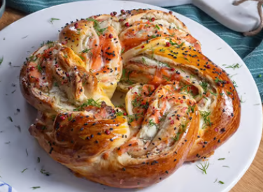 Hacher l'ail et une partie de l'aneth. Mélanger avec le fromage jusqu'à l'obtention d'une texture crémeuse. Dérouler la pâte à pizza et étaler le fromage frais sur toute la surface. Recouvrir avec les tranches de saumon fumé et arroser de jus de citron. Rouler la pâte en serrant bien pour former un boudin. Couper le boudin en deux dans le sens de la longueur puis torsader les deux morceaux de manière à laisser apparaître le saumon. Réunir les deux extrémités pour former une couronne. Dorer au jaune d'œuf et saupoudrer de sésame noir et de baies roses.