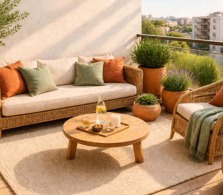 La première étape consiste à libérer complètement l’espace. Sortez temporairement les chaises, les pots, les lanternes, les tapis ou les petits accessoires déco. Une fois l’extérieur dégagé, il devient beaucoup plus simple d’évaluer son potentiel, mais aussi de repérer la poussière accumulée pendant l’hiver.