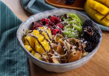 Bowl de spaghettis de crêpes aux fruits.