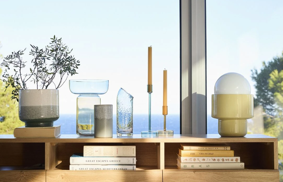 Chez Habitat, le verre devient une véritable signature. La collection Cléo met en avant le verre cristallin soufflé bouche, travaillé avec précision. Les formes rainurées jouent avec la lumière, et chaque pièce présente de légères variations qui rappellent le geste artisanal. Flûtes, verres à vin ou à eau s’inscrivent dans une esthétique à la fois sobre et élégante.