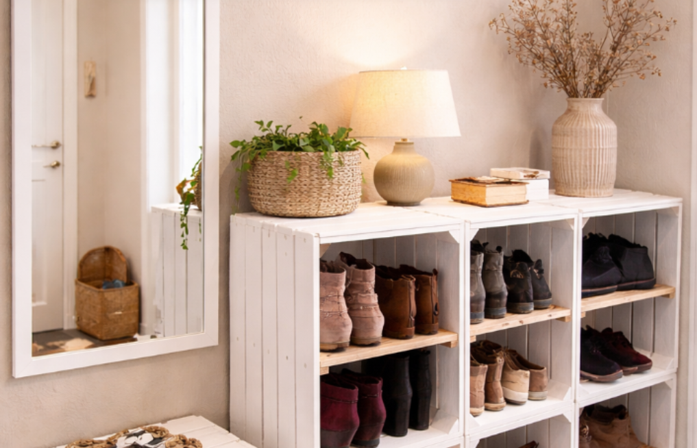 Fabriquer un meuble à chaussures avec des caisses en bois : idées, tutoriel et solutions économiques pour l’entrée.