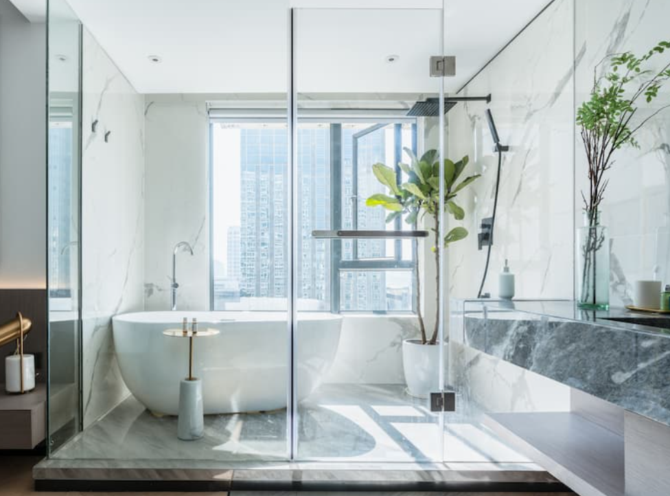 Comment agrandir visuellement une petite salle de bains grâce à la paroi vitrée sans cadre ?